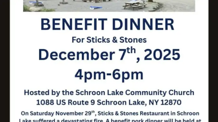 On Saturday November 29th, Sticks & Stones Restaurant in Schroon Lake suffered a devastating fire. A benefit pork dinner will be held at the Schroon Lake Community Church. Suggested donation is $20 but any donation amount is greatly appreciated.