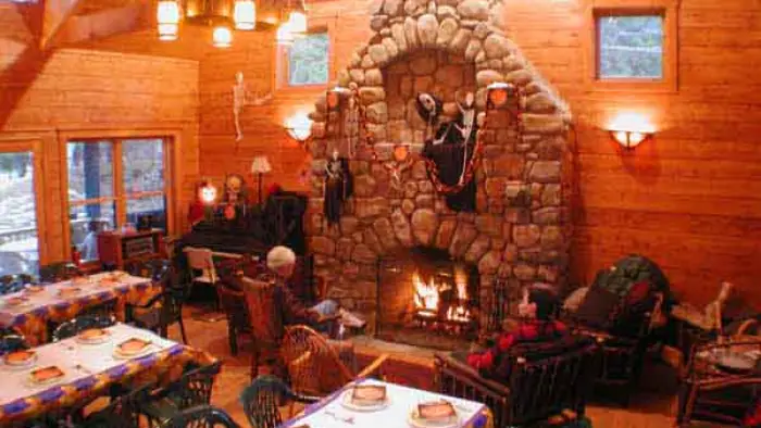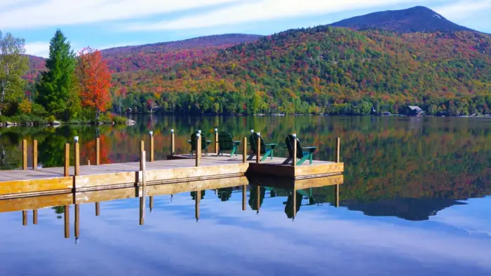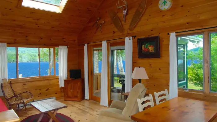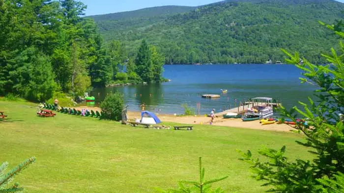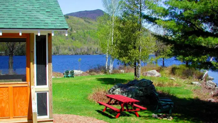 New cottages on Blue Mountain Lake, some with fireplaces, all with full kitchens, porches, outdoor barbecues, and fire rings. Located directly on Blue Mountain Lake with a 200-foot sand beach, conference building with piano and fireplace, free use of canoes, rowboats, and paddleboats, free wireless internet and cable TV.